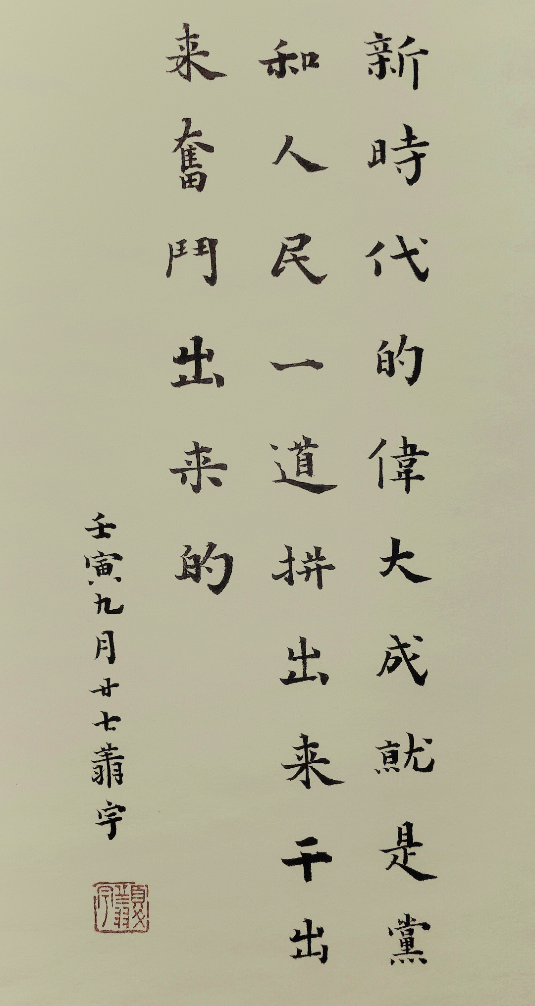 夏翔宇:“新时代的伟大成就是党和人民一道拼出来、干出来、奋斗出来的!”习近平总书记的话语发人深思、给人力量。作为一名入党积极分子,应该以实际行动来回应新时代的到来,认真学习掌握提升书法专业水平,坚信每一项事业,不论大小,只要脚踏实地定能干出来的!