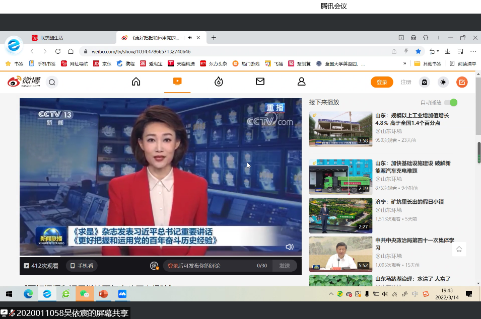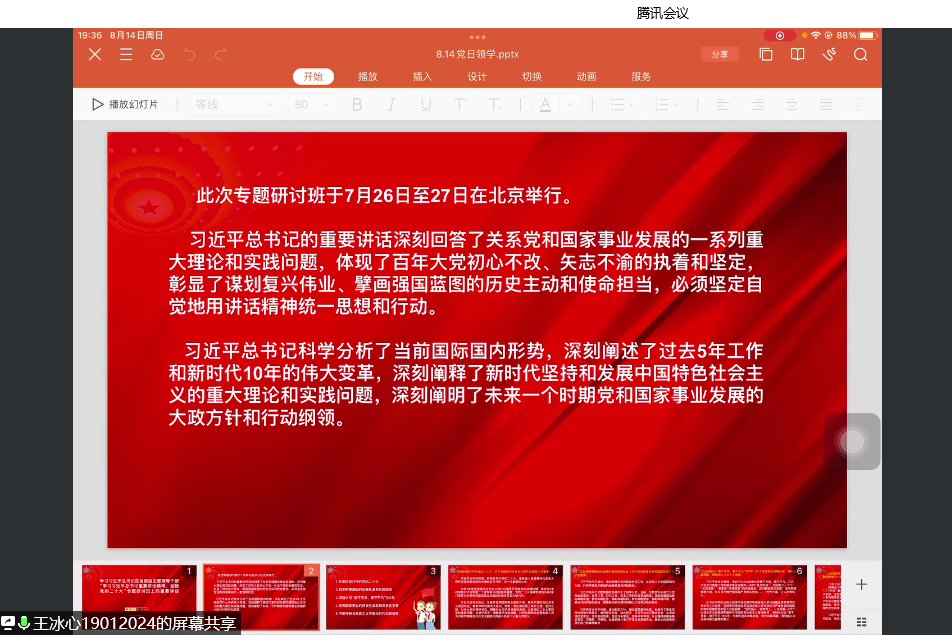 吴依宸、彭晨、程思雯同志分别带领大家学习了《求是》杂志发表习近平总书记重要讲话《更好把握和运用党的百年奋斗历史经验》、习近平总书记在中央统战工作会议上的重要讲话精神、7月28日中共中央政治局会议精神等学习内容。